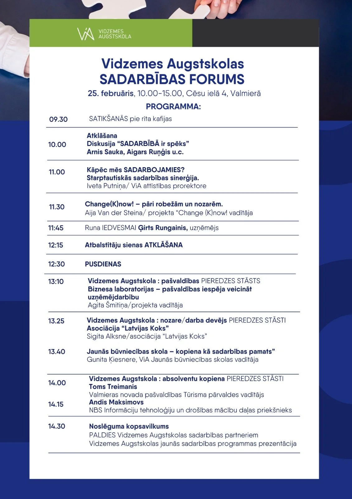 Pasākumu 10:00 atklās profesionāļu diskusija „Sadarbībā ir spēks!”, kam sekos uzruna no Vidzemes Augstskolas attīstības prorektores Ivetas Putniņas prezentācija par sadarbības dimensijām. Savukārt projekta „Change (K)now!” vadītāja Aija van der Steina prezentēs to, kā ViA realizē aktivitātes, kas apvieno un saista izglītības, pētniecības institūcijas, pašvaldības, uzņēmējus u.c.